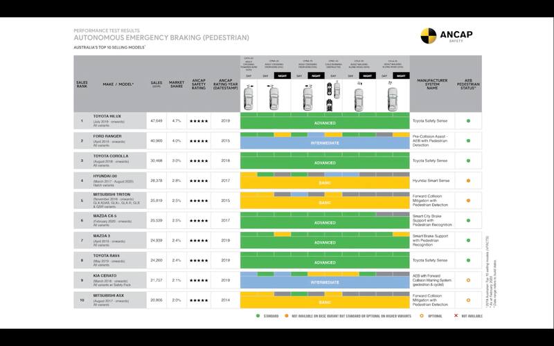 ANCAP comparó la respuesta de este elemento de seguridad activa en los 10 vehículos más vendidos de Australia.
