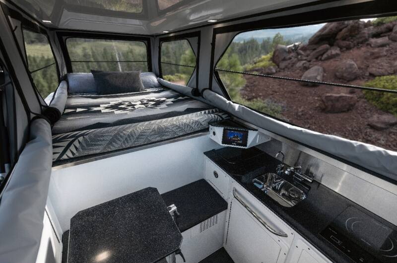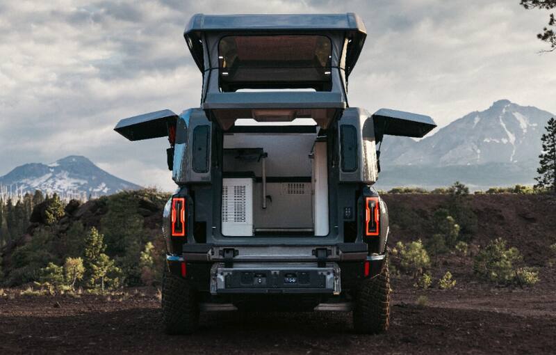 La versión camper de la pick-up eléctrica incluye un techo elevable en fibra de carbono, placas solares y un interior totalmente equipado.