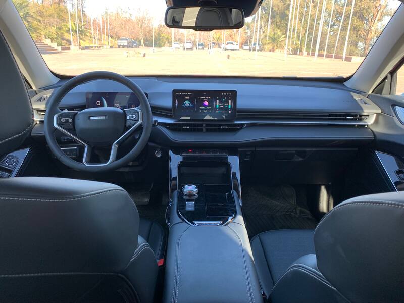 Puertas adentro, el Haval más grande disponible en Chile confirma su impronta de sofisticación. Llama mucho la atención una enorme consola central que divide las dos plazas delanteras y deja un hueco a nivel del suelo como para dejar objetos, que también dispone de conectores USB. A la altura de los brazos, lleva igualmente un doble posavaso que puede convertirse en un compartimento de objetos más clásico, puesto tiene una uña separadora completamente abatible: así, o se llevan dos bebidas o se guardan objetos pequeños de valor. Hay también un cargador inductivo con su respectiva superficie antideslizamiento.