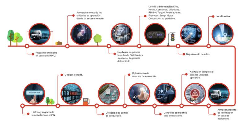 El software de Hino permite monitorear en tiempo real la operación de la flota, entregando notificaciones, alerta y datos que permiten hacer más eficiente la operación, además cuenta con un programa de capacitación diseñado especialmente para conductores y operarios.