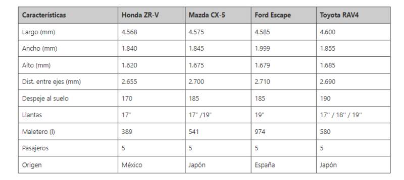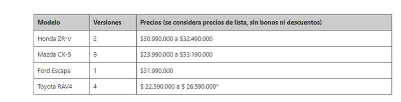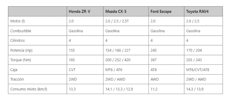 Sin dudas, el Toyota RAV4 es el modelo que ofrece precios más accesibles, al igual que el Mazda CX-5. Es por esta razón, que dependerá del usuario si quiere contar con una mejor motorización y equipamiento, pero esto significa pasarse a algo más costoso y ahí entrarían rivales como el ZR-V y el Escape.