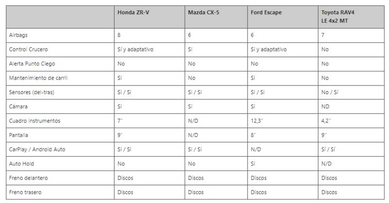 Por otro lado, fue difícil llegar a una comparativa igualitaria con respecto a los precios, ya que la versión de entrada del Honda ZR-V inicia en precio bastante elevados con respecto a su competencia, solo el Ford Escape se asemeja a esta realidad.