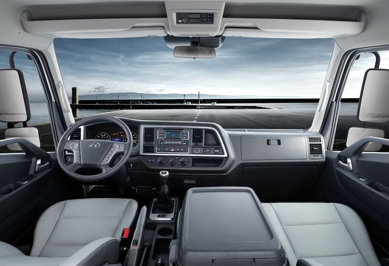 En el interior la cabina es amplia y tiene capacidad para tres personas y está equipada con numerosos compartimentos de almacenamiento para facilitar su organización. Cuenta con radio multimedia de 7′', aire acondicionado y calefacción, alzavidrios eléctricos delanteros, espejos eléctricos, doble espejo retrovisor exterior, volante regulable en altura, luz sobre la cabeza incandescente y mesa abatible al abatir el asiento del ocupante central para poner objetos