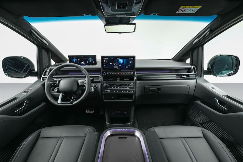 El diseño sigue el concepto “Inside-Out” de Hyundai, donde el interior define las proporciones exteriores. Piso plano, gran altura y amplias superficies vidriadas permiten una cabina luminosa y con libertad de movimiento.
