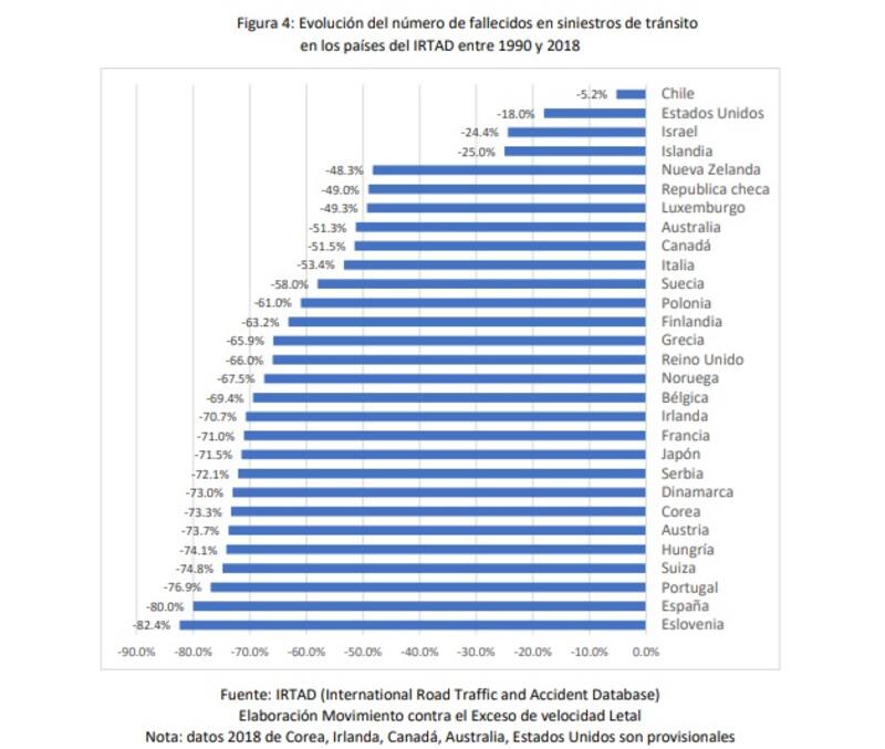 Ahora, si se compara país país, los índices de Chile son más preocupantes. Según el estudio, tomado con datos disponibles en el IRTAD (International Road Traffic and Accident Database), en el listado evaluado que se muestra a continuación, Chile es el que menos ha reducido el número de fallecidos en siniestros de tránsito entre 1990 y 2018. “La mayoría de los países de este grupo tienen una reducción de más del 50%, cuando durante el mismo periodo en Chile la reducción fue solamente del 5,2%”, dice el escrito.
