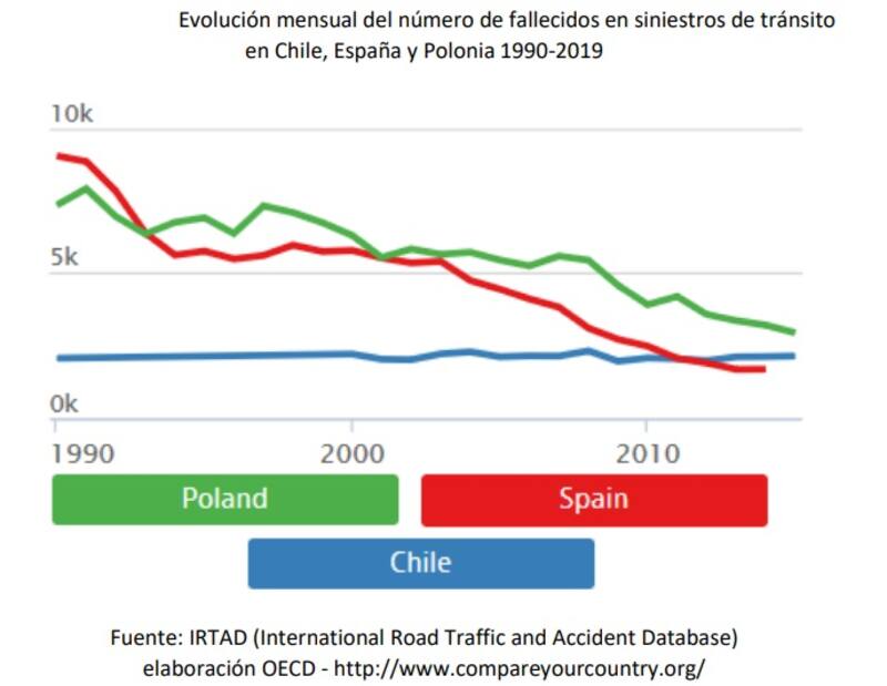 Las cifras más importantes son los números totales de fallecidos y de heridos graves. Si miramos estas cifras, vemos que, al contrario de Chile, varios países han reducido de manera muy significativa el número de fallecidos en el tránsito. En la siguiente figura se puede ver los casos de España (otro país iberoamericano) y de Polonia (país con una economía similar a Chile) que han reducido de manera constante la cantidad de fallecidos en sus calles y carreteras”