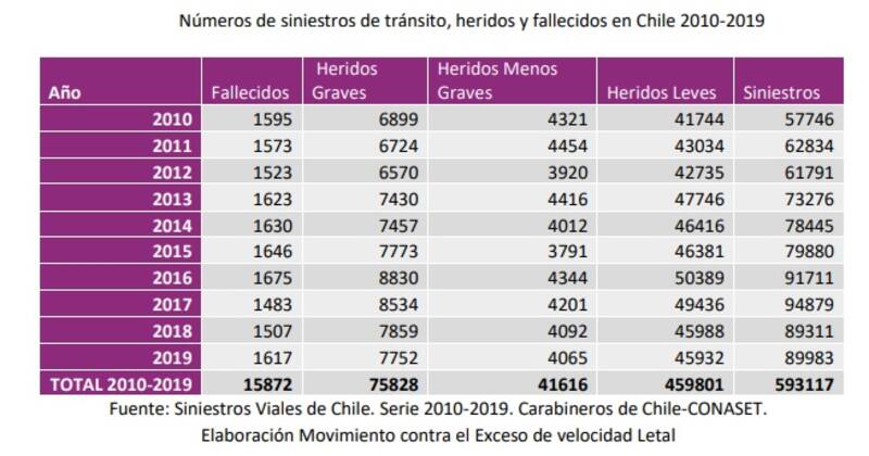 El reciente informe elaborado por Axel Rimbaud para el Movimiento contra el Exceso de Velocidad Letal (MEL) “se basa principalmente en los datos depurados por CONASET, entre los años 2010 a 2019”, según consigna el texto.