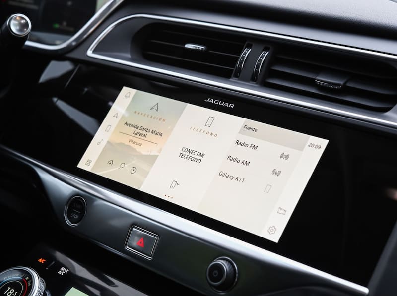 La pantalla de 10′' de la consola cuenta con conexión Android Auto y Apple Carplay, cargador inalámbrico, además del sistema de audio Meridian, Wifi activado con plan de datos con conexión 4G, una aplicación para interactuar en tiempo real con el I-Pace y conocer, por ejemplo, la autonomía.