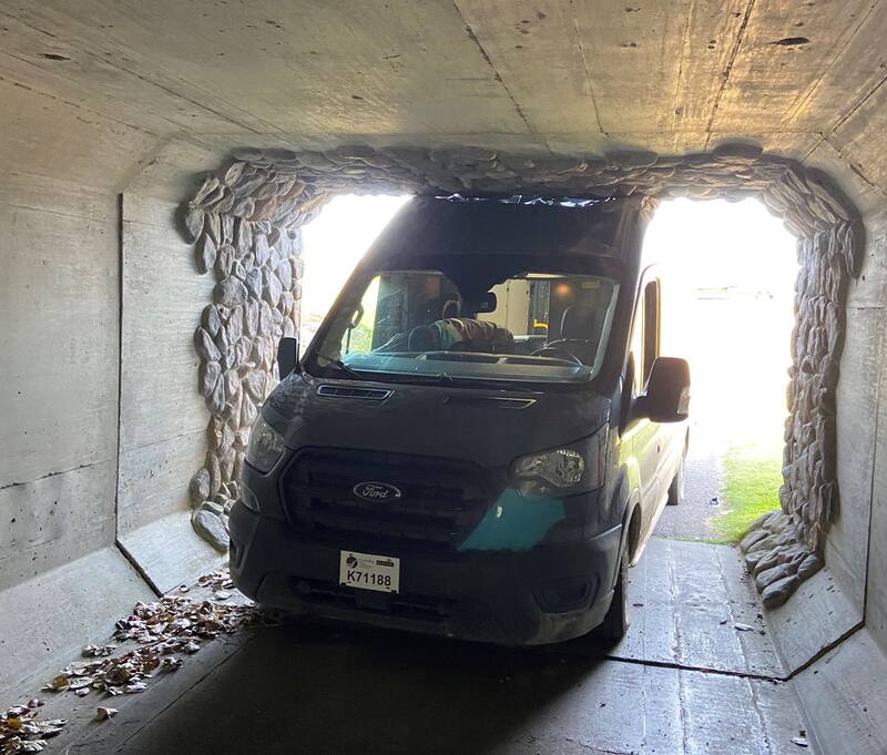 El conductor de un furgón de reparto de Amazon casi terminó estampado en el parabrisas al ver detenida su marcha por un túnel por donde no cabía su Ford Transit.