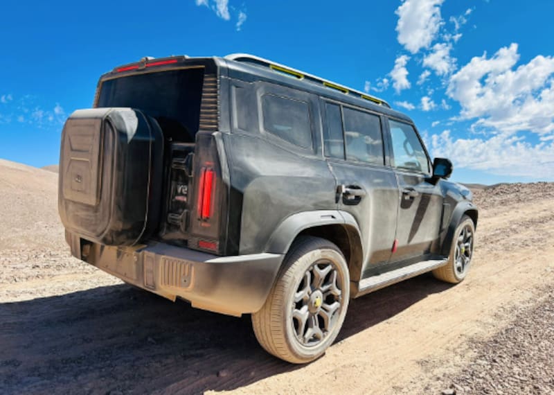 De lado, destacan unas llantas aro 20, unos abultados pasos de ruedas en plástico negro, pisaderas y unas barras de techo funcionales, que soportan hasta 300 kilos fijos y 150 kilos dinámicos. Atrás su vocación aventurera, en tanto, queda clara con la disposición de una rueda trasera ubicada en la puerta de portalón.