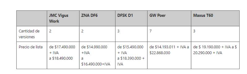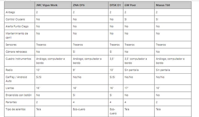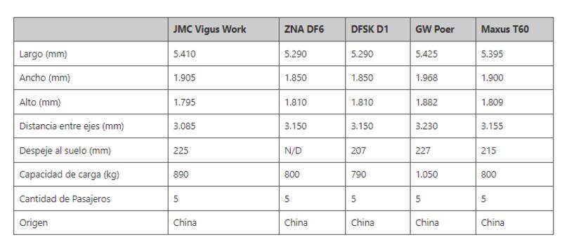 De esta manera, el portafolio de camionetas queda muy variado y dependerá de gustos con cuál quedarse. Sin embargo, quisimos poner a prueba cinco camionetas que sentimos que pueden competir palmo a palmo como lo son la JMC Vigus Work (que se renovó hace unos días), ZNA DF6, DFSK D1 (que se añadió hace días), Great Wall Poert y Maxus T60 (recibió un facelift en mayo).