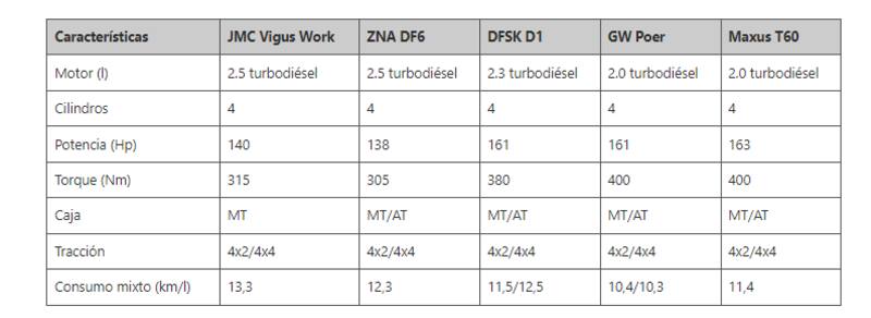 En este ítem predomina la cilindrada grande, motores diésel de cuatro cilindros con turbo. Aquí la que saca una leve ventaja es la Maxus T60 gracias a su nueva potencia y torque, mientras que le pisa los talones la DFSK D1 y la Great Wall Poer.