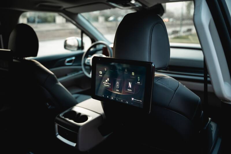 La doble pantalla panorámica curva (cada una de 12,3′') también recibe mejoras, incorporando nueva interfaz de usuario “Rising”. Viene con conexión inalámbrica para los sistemas de Apple Carplay y Andoid Auto, además de cargador inalámbrico de celular, dos puertos USB-C en la consola central y cuatro repartidos en la segunda y tercera fila de asientos.