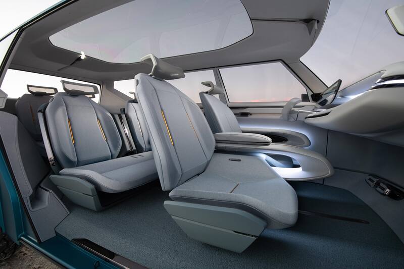 En Active el SUV se mueve, con los asientos mirando hacia adelante. En modo Pausa el interior se transforma en un gran salón, con los asientos de la primera y la tercera fila quedando frente a frente, mientras la segunda fila se baja para formar una mesa.