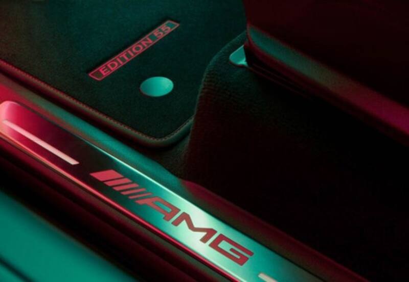 En el interior encontramos como elementos singulares una talonera de acero inoxidable con el logo “AMG” iluminado en rojo, mientras las alfombras son negras con costuras rojas y también lucen el emblema “Edition 55″.