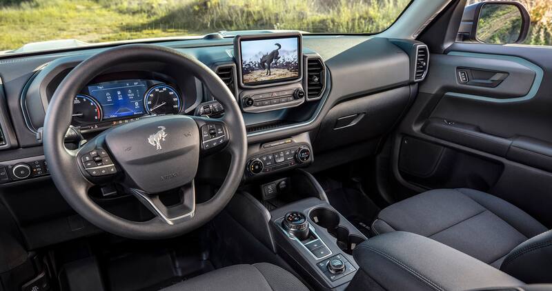 En cuanto a la oferta en confort, el Bronco Sport cumple con solvencia. Se integran desde el modelo más asequible barras de techo horizontales, luneta de apertura independiente, piso lavable, espejos de ajuste eléctrico, sensor de lluvia, tecnología LED para las luces de circulación diurna, los neblineros y los faros delanteros y traseros, vidrios tinteados, climatizador, control crucero, destapador de botellas (en el marco del portalón), seis posavasos, tres tomas de 12 voltios, cluster de 4.2″, termómetro exterior, alzavidrio del conductor de un toque, luces en el portalón (que son capaces de iluminar 40 mt2), volante forrado en cuero con ajuste telescópico, pantalla central táctil de 8″ con enlace a Android y iPhone sin cables, seis parlantes, brújula, botón de encendido, smart key y puertos USB delanteros y traseros tipo A y tipo C.
