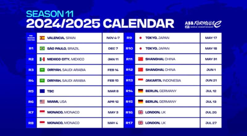 La temporada 2024-2025 se disputará en 11 países, en seis de ellos, habrá citas dobles, es decir, dos carreras el mismo fin de semana. Nos referimos a Diriyah, Mónaco (por primera vez, con fecha doble), Tokio, Shanghai, Berlín, y Londres.
