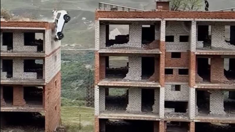 El doble de acción Evgeny Chebotarev, un ruso de 29 años llevó hasta la azotea de un edificio un Lada Niva de color blanco con el que pretendía saltar hacia otro edificio ubicado a unos cinco metros.