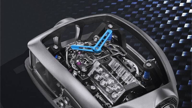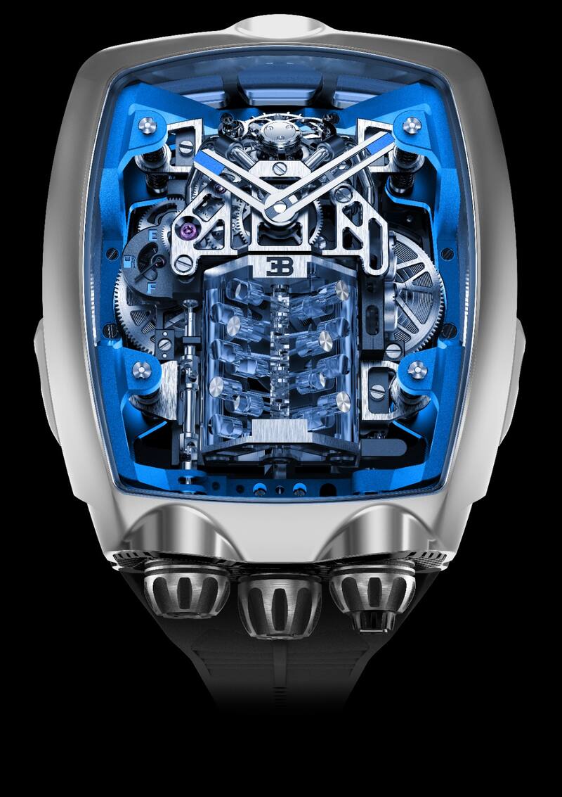 El movimiento completo, denominado Calibre JCAM37 de cuerda manual, está suspendido, casi como flotando al interior de la caja, una que se inspira claramente en las radicales líneas del Chiron para su diseño exterior. Enmarcando el motor hay dos “escapes” que complementan el diseño automotriz de esta verdadera obra de arte de la relojería moderna.