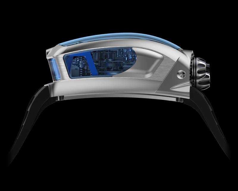 Ubicado bajo un gran cristal de zafiro y completamente a la vista, el “motor” de este reloj se anima al pulsar la corona ubicada en el lado derecho.