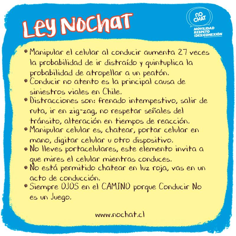 Respecto de la publicación en el Diario Oficial, Claudia Rodríguez, directora ejecutiva de la ONG “No Chat” entidad que ayudó a impulsar esta ley, se mostró muy satisfecha con el avance de la iniciativa y con la promulgación. Eso sí, al margen de las multas y sanciones que aumentaron, precisó que “lo que buscamos es que se evidencie que, tal como la velocidad mata e ir bajo los efectos del alcohol y las drogas mata, la manipulación por dispositivos móviles también mata, más considerando que la principal causa de siniestralidad vial en Chile es la conducción no atenta, donde el celular es una de las principales causas, y que deja todos los años 25 mil siniestros por conducir no atento y más de 12 mil lesionados, por lo tanto es un problema muy grave y que lo hemos normalizado. Entonces, lo que busca la ley No Chat es efectivamente evidenciar este problema y fortalecer la ley de tránsito en su conjunto”.