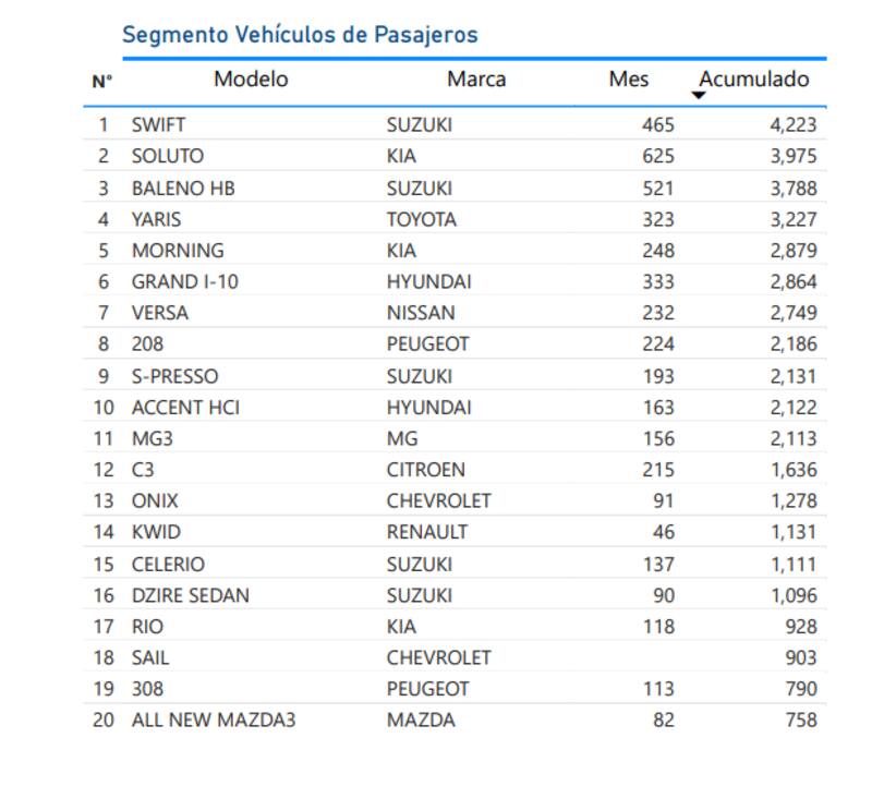 Los otros modelos de la marca japonesa que se encuentran en el top 20 es el Baleno, S-Presso, Celerio y Dzire sedán.