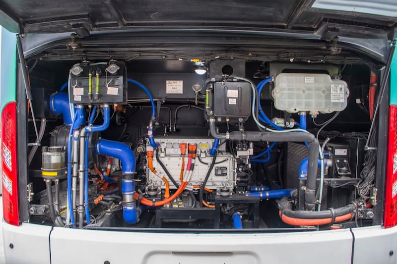 Esta energía luego es utilizada por motores eléctricos, por lo tanto, este bus es en esencia un vehículo eléctrico. En el proceso, sólo se genera agua y calor como únicos residuos, eliminando emisiones contaminantes. Esta configuración permite una autonomía de hasta 400 kilómetros con sus estanques de hidrógeno y baterías totalmente cargados.
