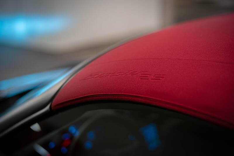 La edición limitada combina el interior en cuero burdeo con la capota de lona roja que incluye la inscripción de “Boxster 25″. Además, tiene paquete en su interior en aluminio, asientos deportivos regulables en 18 posiciones, la leyenda “Boxster 25″ en el umbral de las puertas y el volante deportivo multifunción GT de cuero y calefactado.