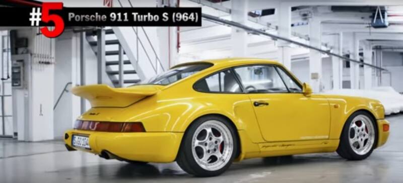 5. Porsche 911 Turbo S (964): Fue fabricado en 1992 y muchas de sus piezas provienen directamente del motorsport. Con un color exclusivo amarillo, tiene una potencia de 355 Hp, solo existen seis en su tipo y su precio era de 146.000 euros.