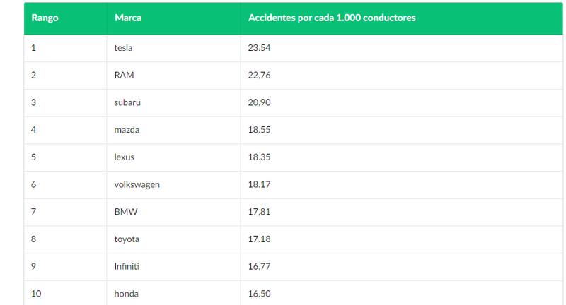 Ram y Subaru fueron las únicas otras marcas con tasas de accidentes superiores a 20,00 por cada 1.000 conductores.