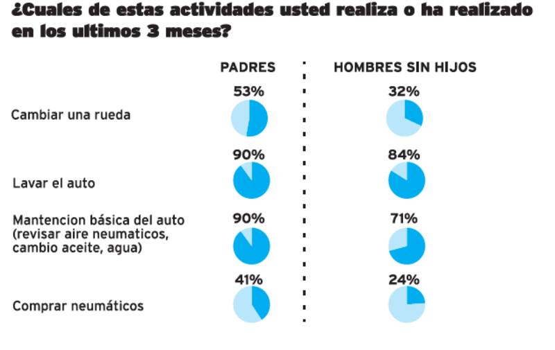 El 90% de los Padres asegura haber hecho una mantención básica del auto (revisar el aire de los neumáticos, cambio aceite y/o agua), muy por sobre el 71% de los que no tienen hijos. Una brecha similar se da en “Cambiar una rueda”, donde el 53% de los Padres declara haberlo hecho, contra el 32% de los Hombres sin hijos; el 41% de los papás compró neumáticos en el periodo cuestionado, mientras que solo el 24% de los que no tienen lo ha hecho.