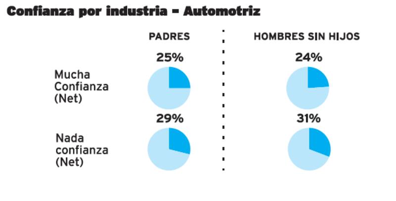 A pesar de que la relación entre Hombres y la industria es potente, según el informe de Chile 3D demuestra que ésta ya no está en los primeros lugares en el ítem confianza, sobre todo en quienes ya tienen hijos, donde Tecnología, electrohogar y línea blanca lidera lidera entre las industrias con mayor Confianza, con un 42%, seguido por Aerolíneas (33%) y Farmacias (29%), dejando en el sexto puesto a la industria Automotriz con 25%. La diferencia, eso sí, entre aquellos que no tienen hijos es mínima y marca solo un punto porcentual menos (24%), aunque la posiciona en el mismo escalón entre las otras industrias.