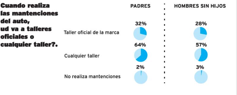 Así entonces, el estudio revela que en la pregunta de “Cuando realiza mantenciones del auto, ¿usted va a taller oficiales o cualquier taller?” El 32% de los Padres declara ir al taller oficial de la marca, mientras que los Hombres sin hijos baja en 4 puntos porcentuales (28%); el 64% responde ir a cualquier taller, versus el 57% de los que no tienen hijos y sólo el 2% de los Padres declara no hacerle mantenciones, solo un punto menos que los sin hijos.