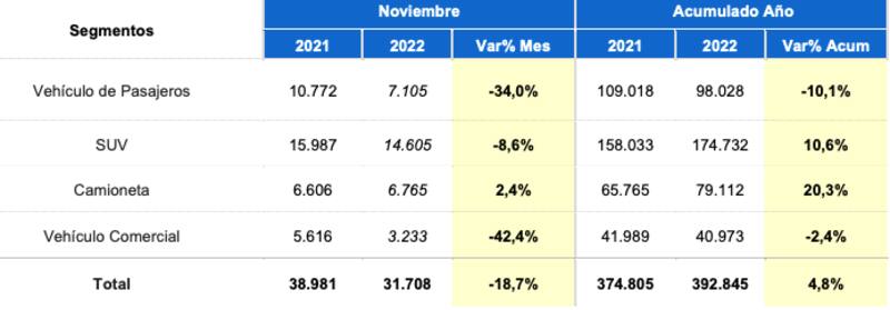 Más allá de la caída del mercado automotor registrada en noviembre, los SUVs continúan siendo por lejos la carrocería preferida de los chilenos. De las 31.708 unidades comercializadas durante el penúltimo mes de este año, 14.605 corresponden a autos de este tipo. Mucho más atrás le siguen los vehículos de pasajeros con poco más de siete mil matriculaciones.