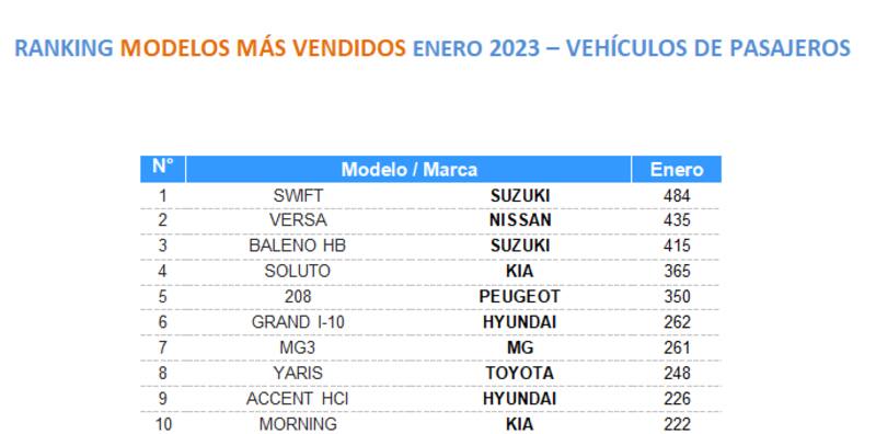 A continuación, los 10 vehículos de pasajeros más vendido en enero del 2023: