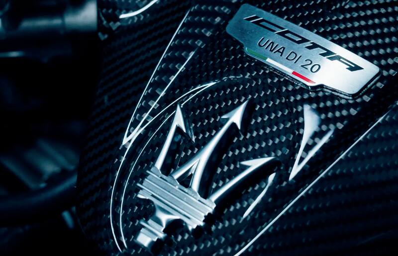 El Maserati MC20 Icona reproduce los mismos colores del MC12 Stradale estrenado en 2004, con la carrocería combinando blanco y azul y la bandera italiana debajo del emblema con el nombre del modelo en la puerta del conductor.