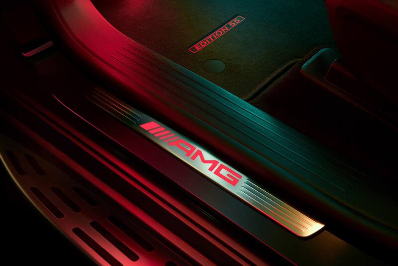 Las placas de los umbrales de las puertas son de acero inoxidable y presentan las letras AMG retroiluminadas en rojo. Combinan con las alfombrillas AMG negras de velour con las costuras rojas y la inscripción Edition 55.