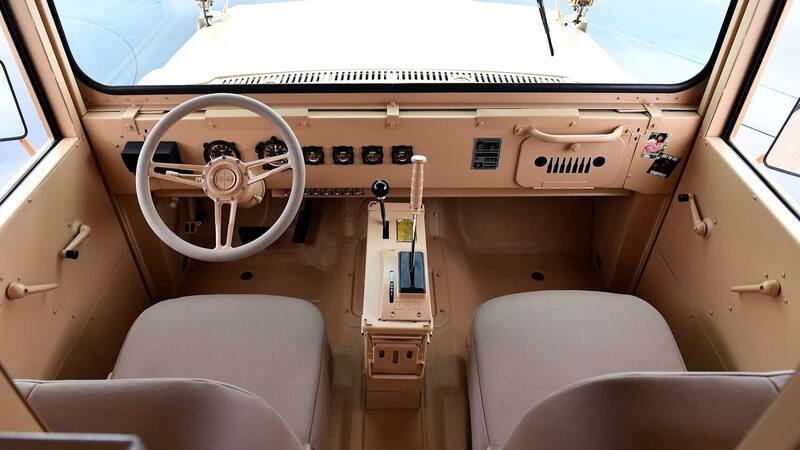 Una placa de metal, ubicada en el panel de instrumentos y específicamente diseñada para este concepto, muestra las especificaciones únicas del Kaiser Jeep M725 Concept.