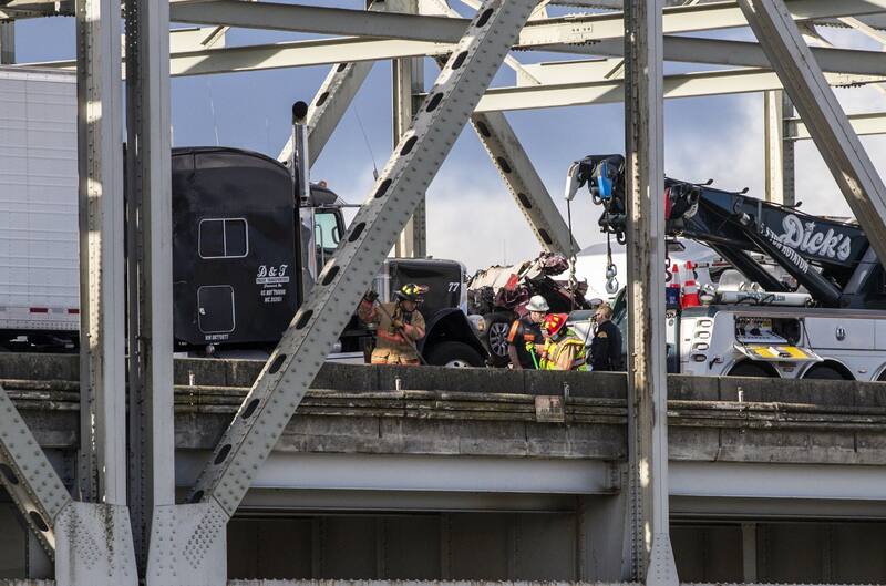 La conductora pudo salir por sus propios medios una vez que una grúa levantó el camión Peterbilt. Fue llevada al hospital para tratarla por pequeños dolores en una costilla y en la cabeza.