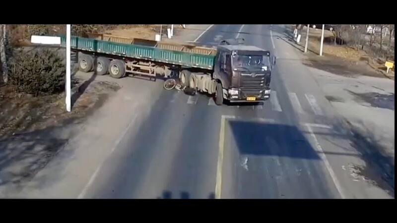 Como puedes ver, este ciclista hubiera sido hombre muerto si hubiera tenido peor suerte. El camión lo golpea por el costado, los dos ejes del tracto pasan a milímetros de él y luego los tres ejes dobles del acoplado lo pasan literalmente por el medio.