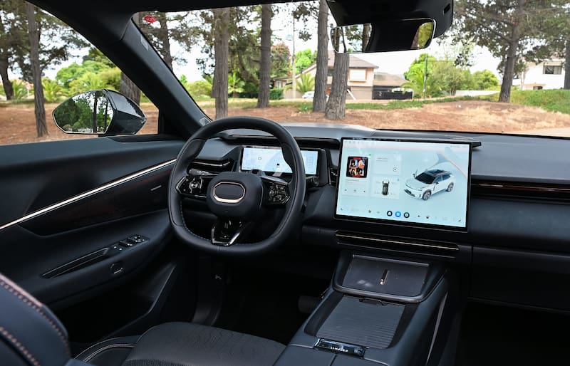 Adentro, incorpora asientos delanteros ventilados con ajuste eléctrico, memoria y soporte lumbar con tapiz de cuero Nappa, luz ambiental ajustable en color con movimiento sincronizado con música, guantera con cierre electrónica y cubre maletero retráctil. La versión Halo agrega asientos delanteros y volante calefaccionados, asientos delanteros con masajeador, sistema de climatización avanzada Tri-Zona, y un completo sistema de audio marca Harman Kardon de 1.600 W de 23 altavoces.