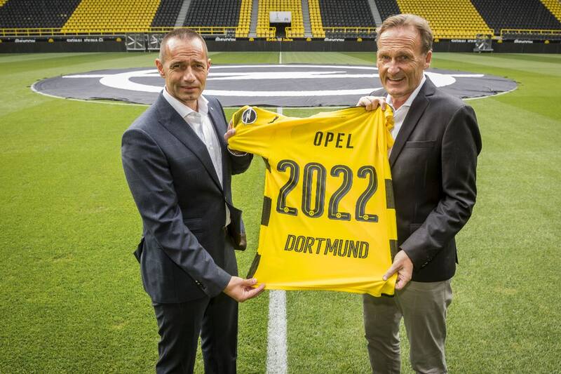 La unión de Opel y el BVB data de 2012. De acuerdo con el fabricante de PSA, estudios del instituto Nielsen Sport y de la Universidad Técnica de Braunschweig reconocen esta unión como una de las más creíbles y sostenibles del fútbol alemán. "La alianza entre ambos forma un componente clave del desarrollo positivo de Opel en los últimos cinco años", explicaba la marca del rayo en agosto de 2017, cuando se negoció una extensión del contrato hasta la temporada 2022. La excelente relación entre el club y el fabricante de Rüsselsheim ha dado pie también para que Jürgen Klopp, el ex entrenador de los negriamarillos (hoy en el Liverpool), haya posado en varias ocasiones junto al nuevo auto fabricado en Zaragoza.