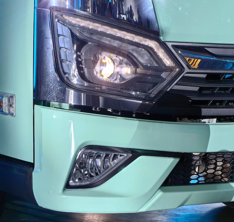 En el mundo de los camiones es poco lo que se puede innovar en términos de estilo, pero de igual forma el Miler consigue separar su planteo estético del resto de camiones, esto es gracias a que la marca decidió integrar elementos que por lo general solo suelen estar presentes en vehículos livianos. Esto lo podemos notar en su frontal, que incorpora dos enormes elementos cromados que descienden desde los pilares hacia los faros, provocando un efecto espejo bastante extraño, pero meritoriamente propio. Efecto que además se mezcla con los faros full LED, que además tienen encendido automático.
