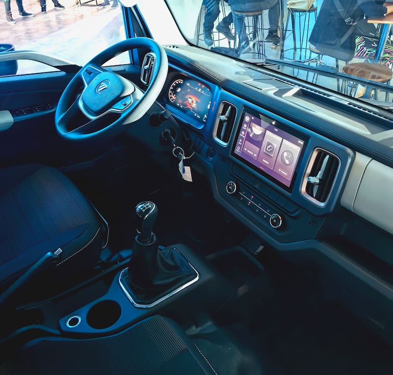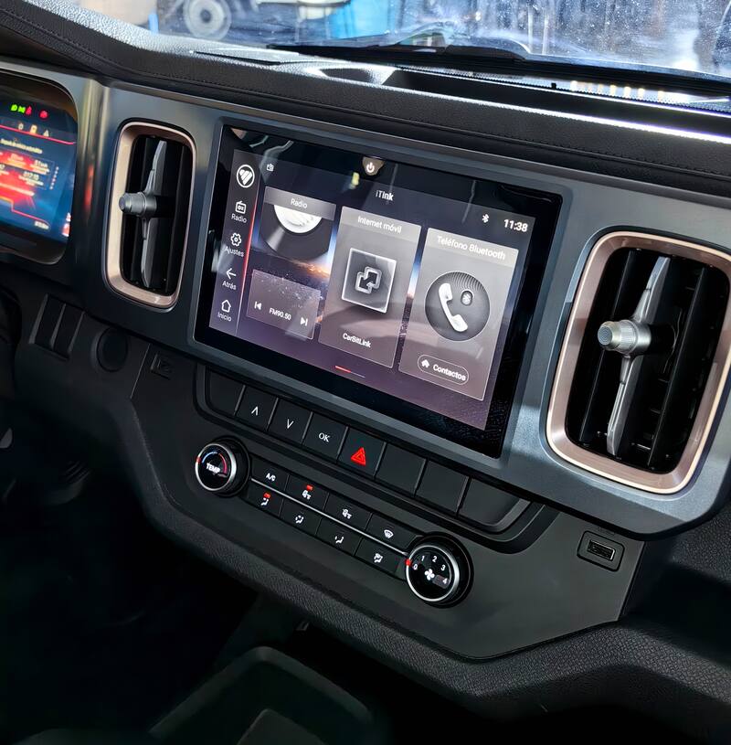 Desde ahí, saltamos a la otra pantalla, de 9 pulgadas, que opera las funciones de infoentretenimiento, contando con bluetooth, mirrorlink y cámara de retroceso. Contando además con dos puertos USB en el tablero, para cargar más de un dispositivo al mismo tiempo durante la jornada laboral.