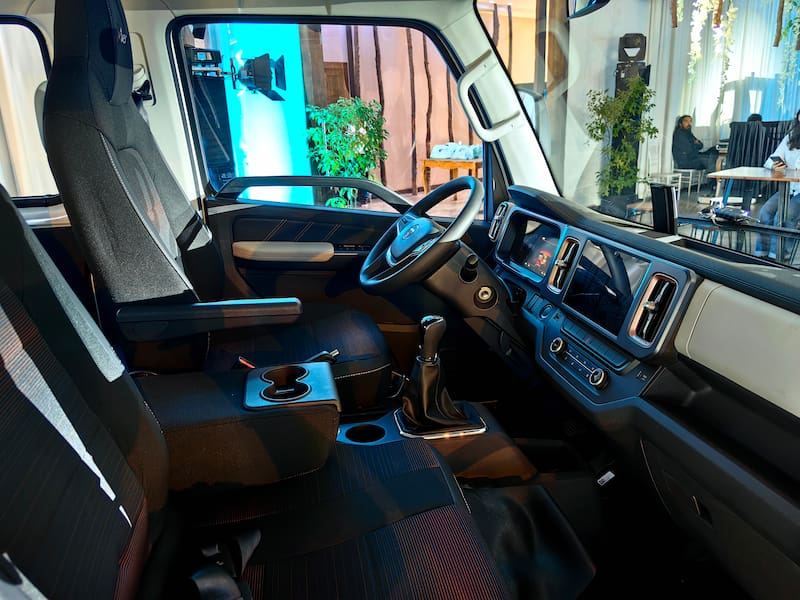 Si lo anterior no suele ser común en camiones ligeros, el resto del equipamiento es todavía más extraño, ya que cuenta de serie con aire acondicionado, vidrios eléctricos en todas las puertas, siendo one touch los delanteros; cierre centralizado con mando a distancia, comandos de radio en el volante, control crucero, piso de goma para el habitáculo, 4 portavasos, luz LED para el interior, múltiples manillas para sujeción dentro de la cabina, asiento del conductor con suspensión hidráulica, doble guantera, regulación de altura para el cinturón de seguridad del conductor, apoyabrazos central delantero, regulación eléctrica de las luces delanteras y detalles de ecocuero en las puertas. Lamentablemente extrañamos la presencia de bolsas de aire frontales, las cuales serán incorporadas próximamente.