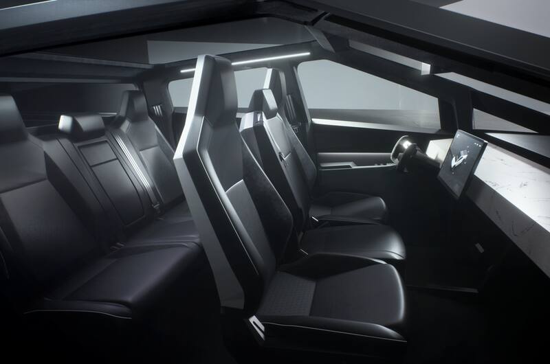 Para sus aptitudes fuera del asfalto, la pick-up de Tesla -en cualquiera de sus tres variantes- está dotada de ángulos de ataque y de salida de 35° y 28°, respectivamente. En el interior, dispone de seis plazas, aunque el asiento del medio en la primera fila es de tipo banqueta. El tablero es más bien simple y lleva en el centro una pantalla táctil de 17 pulgadas.