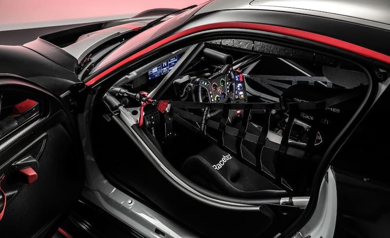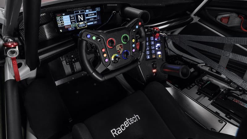 El 911 GT3 R está basado en la plataforma actual del 911 de la generación 992, pero con una distancia entre ejes ampliada en 48 mm y con un chasis cubierto casi por completo con paneles de carrocería de fibra de carbono.