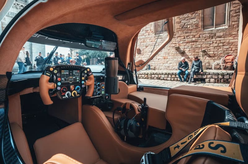 Con respecto al interior, la fibra de carbono fue sustituida por cuero y Alcantara, en tanto, que se añadieron soportes para colocar auriculares y casco, una superficie para ubicar el ordenador portátil necesario para arrancar el auto y un portavasos retráctil.