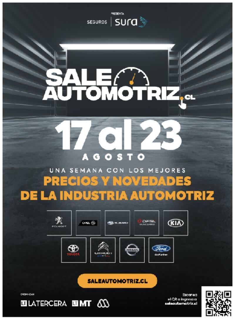 Del 17 al 23 de agosto, marcas como Peugeot, Opel, Subaru, DFSK, Kia, Toyota, Citroën, Nissan y Ford se reunirán en esta vitrina digital llamada www.saleautomotriz.cl con descuentos y promociones especiales.