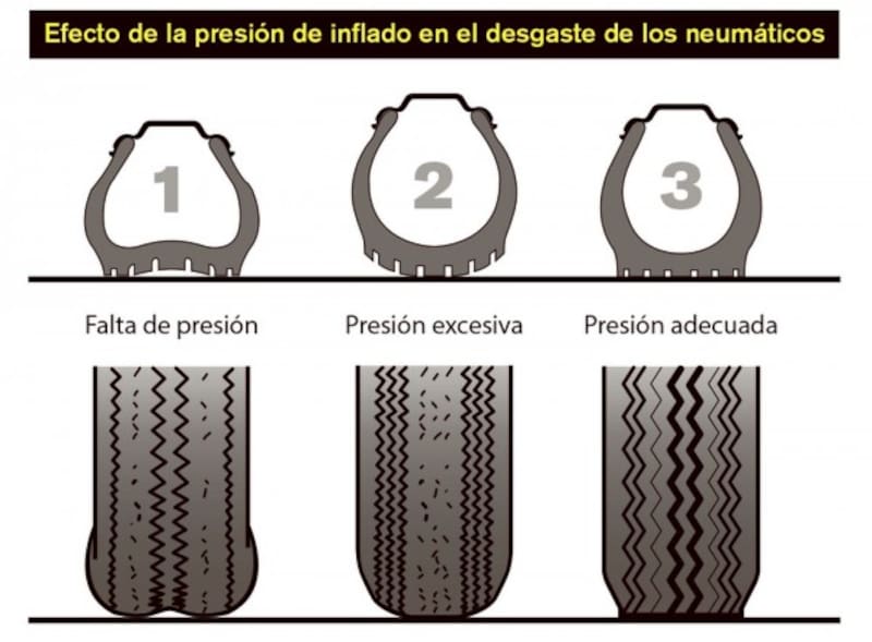 En el caso que tengas más aire que el señalado por el fabricante, la superficie de apoyo es menor, lo que reduce la adherencia y aumenta el desgaste en el centro de la huella. Por el contrario, llevar menos de la presión indicada, desemboca en una mayor superficie de apoyo, incrementándose el consumo de combustible y desgastándose las bandas.